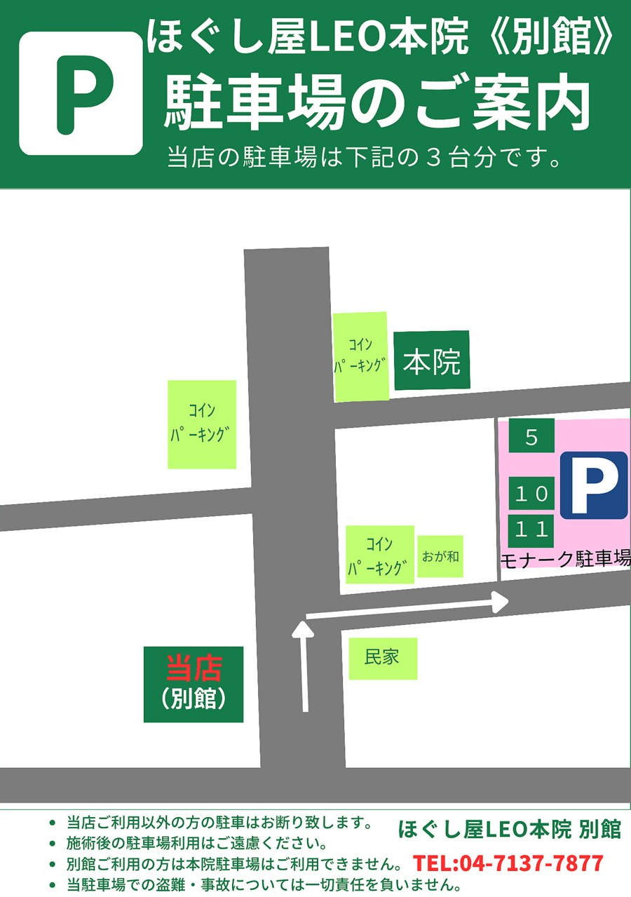 JR南流山駅北口を出て、交番を右折し線路沿いを直進します(100M程)。美容室belleza様を左折し、2軒目の姉妹店「ほぐし屋LEO」を通り過ぎ直進します(50M程)。コインパーキング(ザ・パーク)を右折し、美容室RAGU